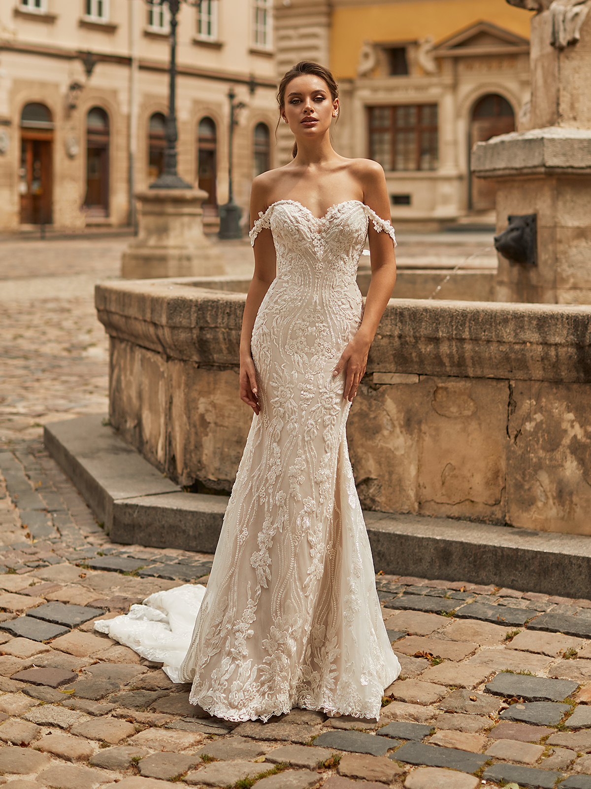 If you’re looking for something a little more form-fitting and glamorous, Val Stefani Style Paris is decorated with botanical-inspired re-embroidered floral and vine lace appliques that accent its sexy mermaid silhouette. The sweetheart chapel train will make for a sweet, graceful detail for the bride that plans to tie the knot at an outdoor garden wedding venue.