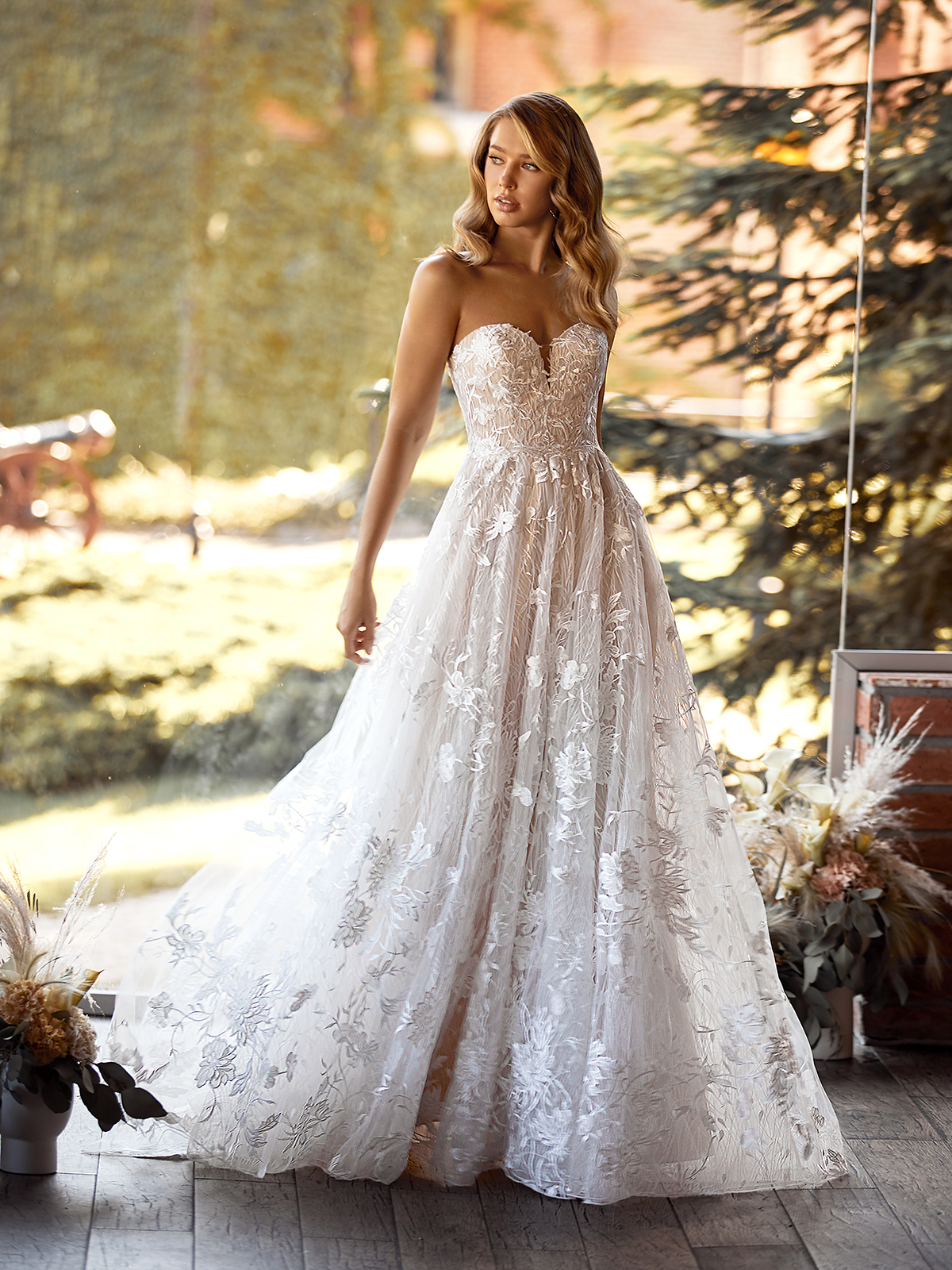 Make a charming statement in Style Madrid, a floral lace design that is crafted with crystals, rhinestones, and specialty beading. Romantic re-embroidered lace appliques accented with sequins replicate the flourishing flowers from the springtime season and are complemented throughout the gown, making you look like a garden goddess.