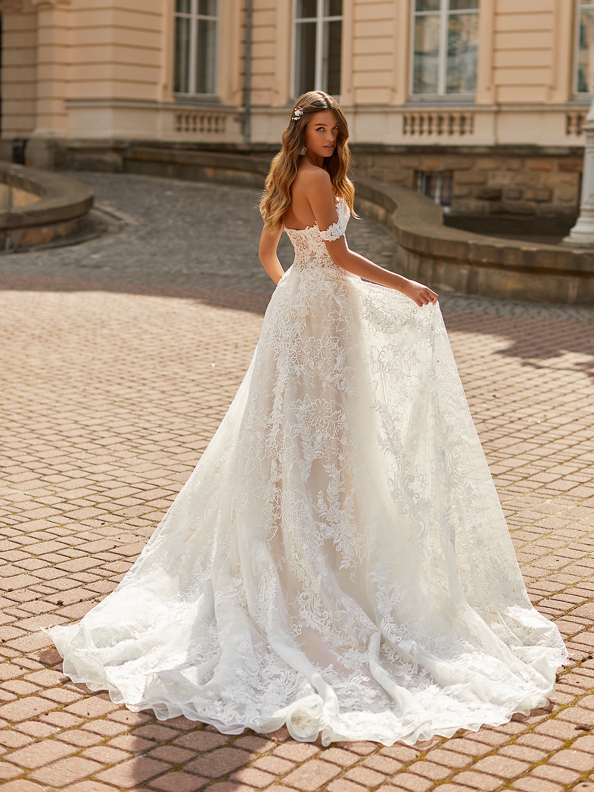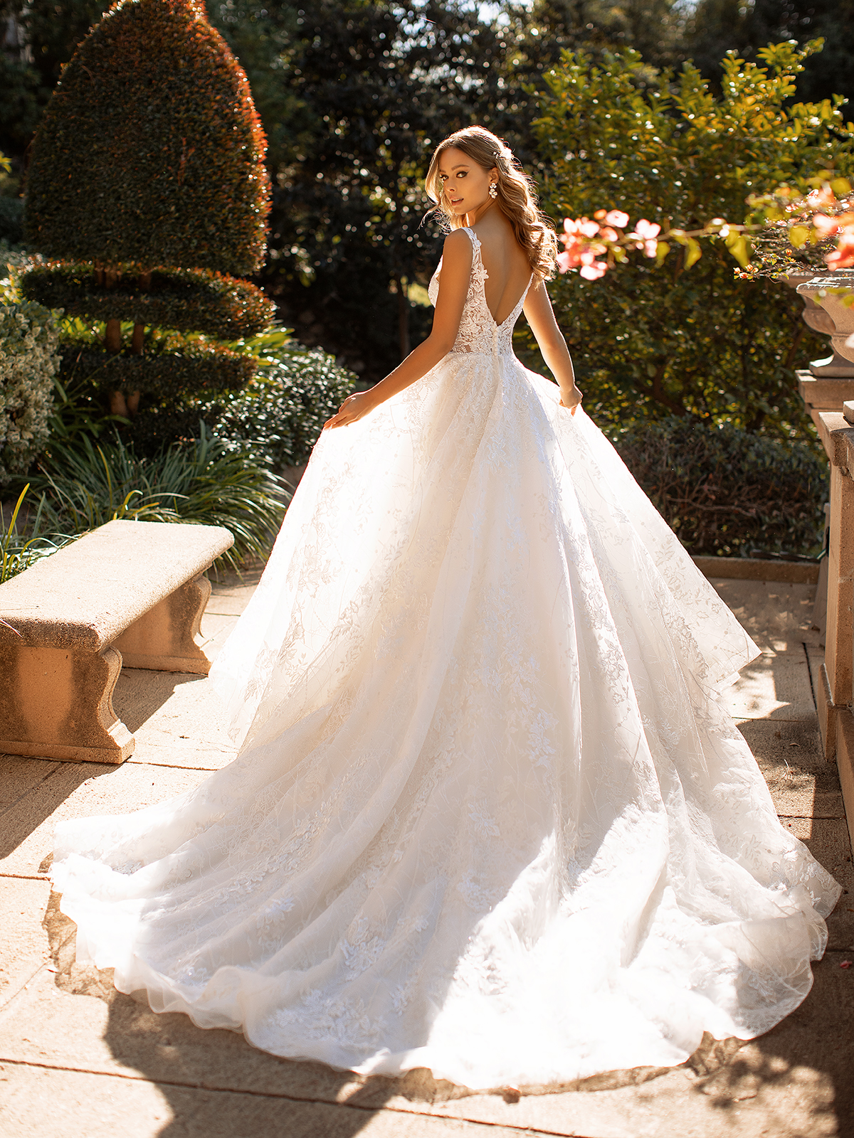 Style Madrid has captured our hearts! This full A-line lace wedding gown features embroidered lace appliques with sequins. The chapel train includes a horsehair trim hem finish, perfect for a bride that wants that fairy tale princess wedding day look.