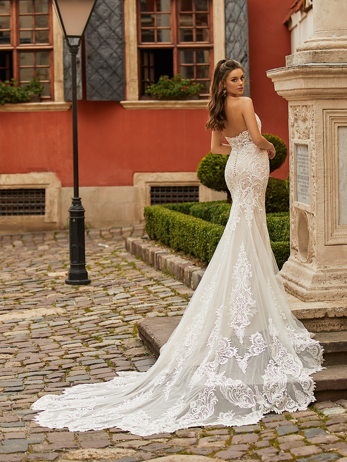If you are searching for a more fitted silhouette, Style Vienna is a perfect choice. This classic sweetheart mermaid wedding dress takes your look to the next level with its filigree accented illusion train. The train starts right under your behind creating a shapely figure before it flares out into a statement leaf shaped design.