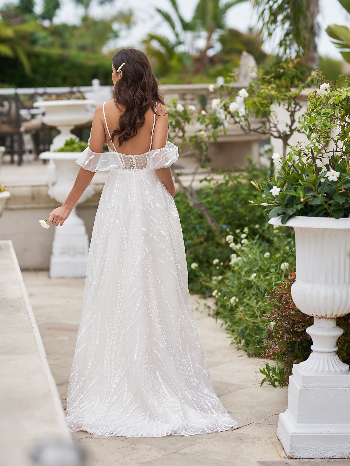 Style Oralee, is a sparkly A-line wedding dress with semi-cathedral train that will have you feeling like a fairy tale princess. Grand from the front and back, this beaded gown flows with romance and will have you feeling like royalty as soon as you step in it. The dreamy skirt fans out into a semi-cathedral train that includes a wide horsehair trim hem finish.