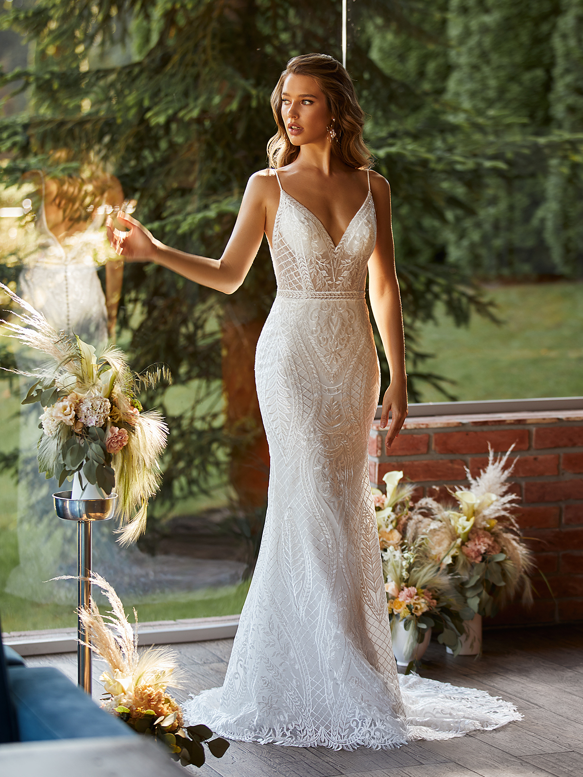 If you’re a bride who loves lace, you’ll love Simply Val Stefani style ATLAS. A lace gown inspired by greek geometric designs, the lines of the dress swirl from the front to the back to accentuate all of the bride's natural curves. The lace details on this mermaid bridal gown blend beautifully to enhance both the bust and waist. This design features a daring V-neck, sequin detailing, spaghetti straps, and a low back. Be sure to take photos from different angles in this unique mermaid gown.